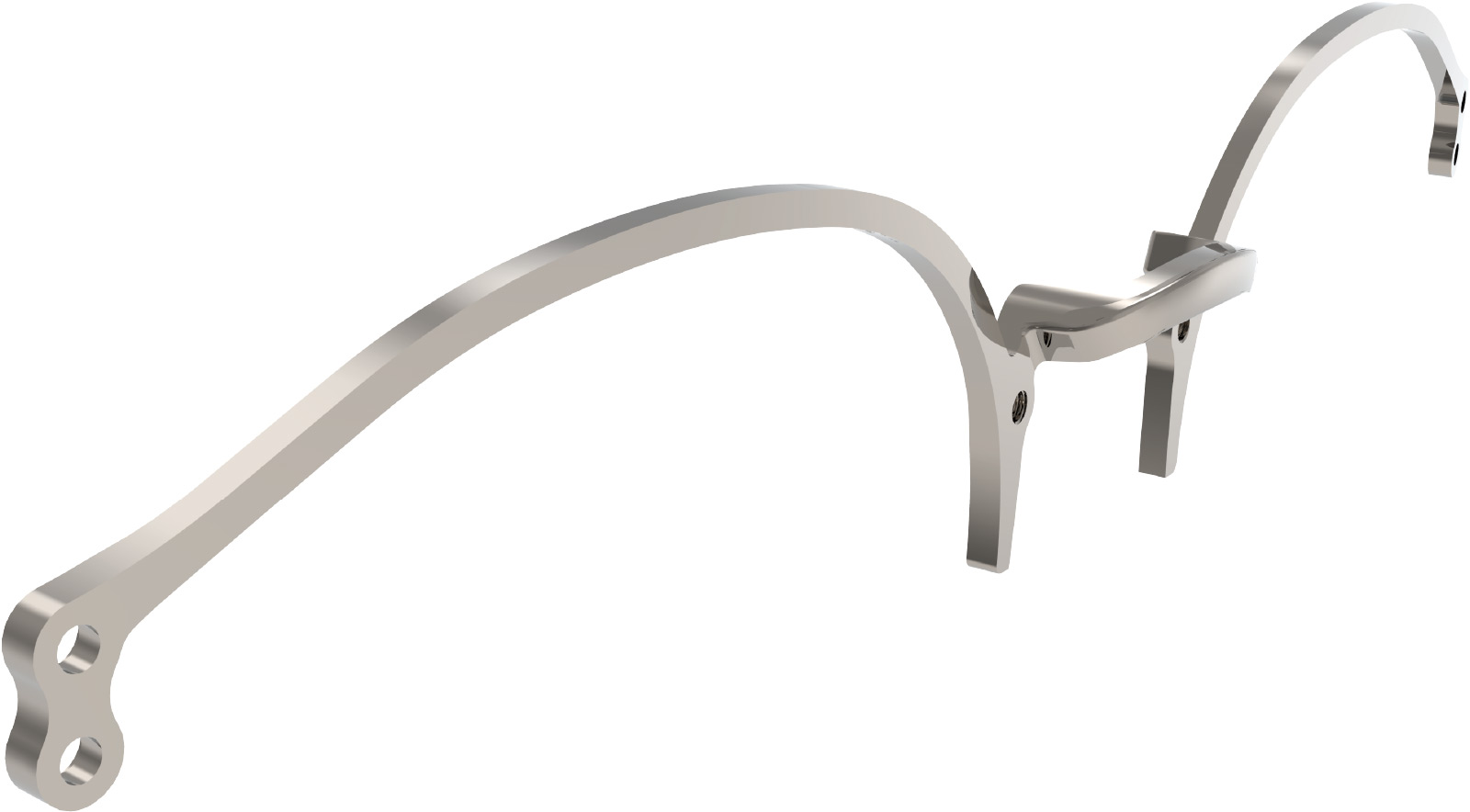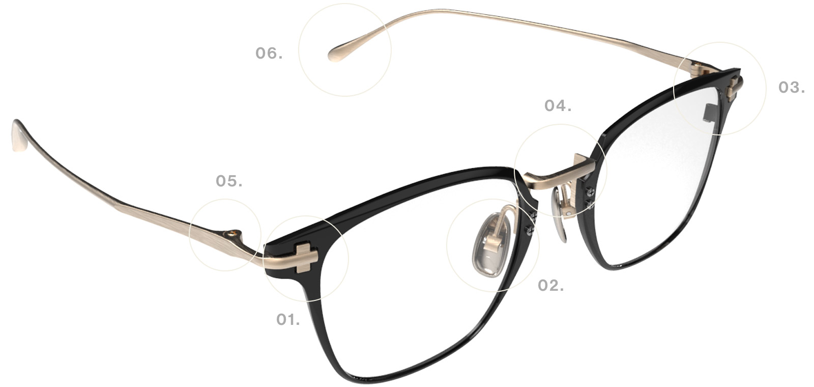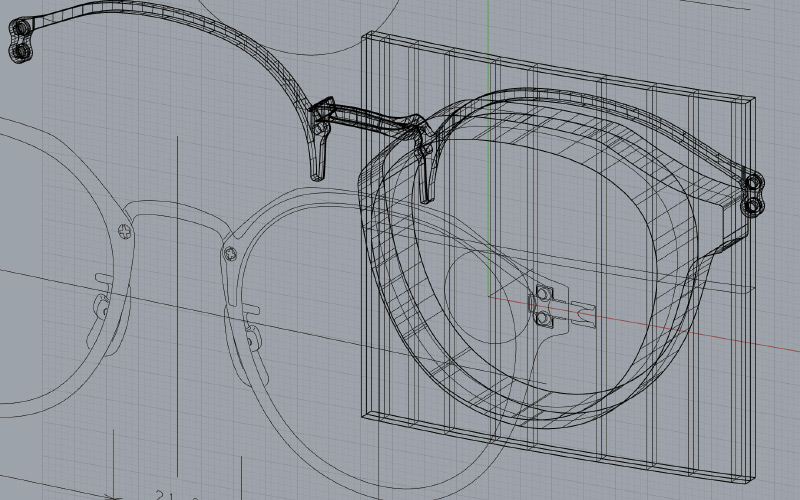 背骨や脊髄を意味するスパインから名前をつけたオリジナルパーツ。アセテートのような経年変化しやすい素材に組み合わせることで変形を防ぐ効果があります。画像は2022AW新型voidのCG作成時の途中経過データ。中央奥側に見えるT-スパインが表側のアセテートリムを支える設計になっています。