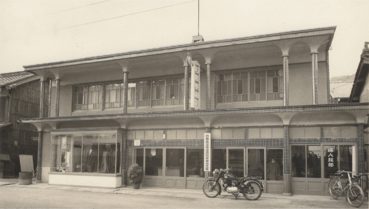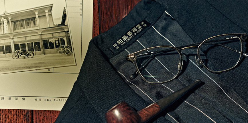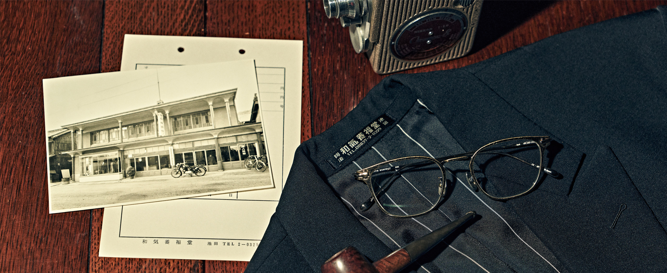 Designer Satoshi Waki's grandfather ran a tailor shop in Shikoku after the war. You can see the store at that time in this photo. It is a modern building with pillars made of mosaic tiles and designed windows. The jacket, which was tailored by grandfather about 40 years ago, has a tailoring that cannot be seen in modern times. Waki's grandfather spared no effort in invisible parts such as the lining and details such as buttons and stitches. The attention to detail is inherited by TAYLOR WITH RESPECT's brand concept.
