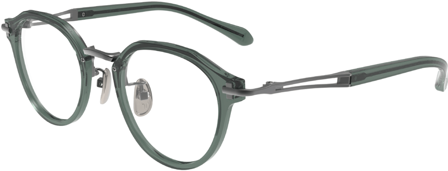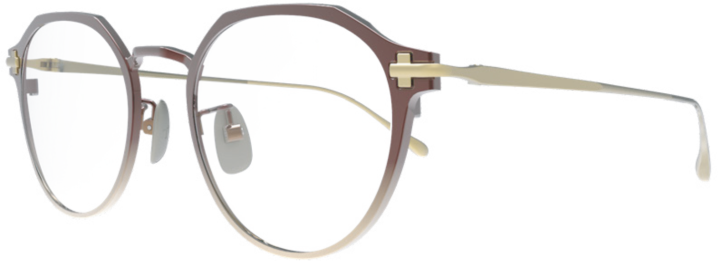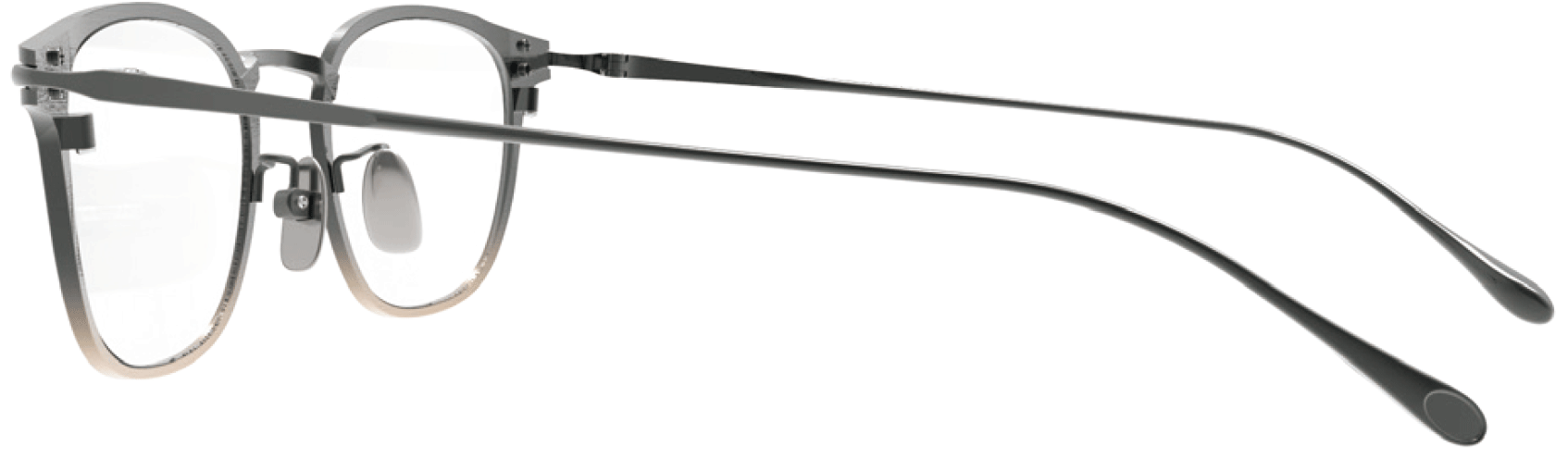 T-SPINEは、フロントの経年変化を抑えるだけではありません。透明感のあるアセテートとの相性も非常に良く、補強の役割を超えて、眼鏡全体の美観を高める重要なパーツとして機能しています。眼鏡の強度と形状の維持を可能にしつつ、前面から弧を描くように透過して見える姿はデザインとしても美しい仕上がりです。